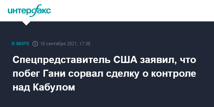 В интервью изданию Financial Times Халилзад указал, что отъезд Гани привел к "срыву в последнюю минуту заключения соглашения с "Талибаном", нацеленного на то, чтобы не допустить попадания Кабула в руки исламистов, и на то, чтобы начать переговоры о политическом переходном процессе".