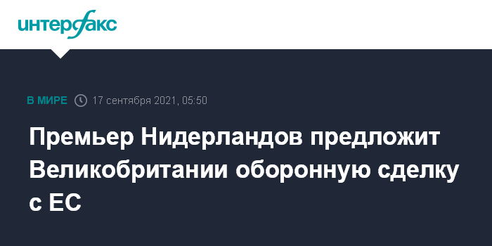 Москва. 17 сентября. INTERFAX.RU - Премьер-министр Нидерландов Марк Рютте предложит своему британскому коллеге Борису Джонсону заключить соглашение с Евросоюзом в области обороны и безопасности, сообщает The Times со ссылкой на осведомленные источники.