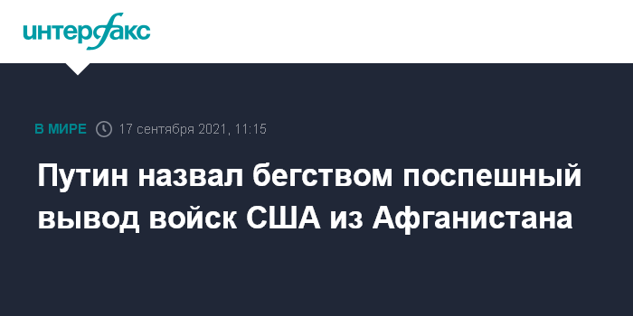 Москва. 17 сентября. INTERFAX.RU - Президент РФ Владимир Путин назвал бегством уход из Афганистана войск США и их союзников по НАТО.