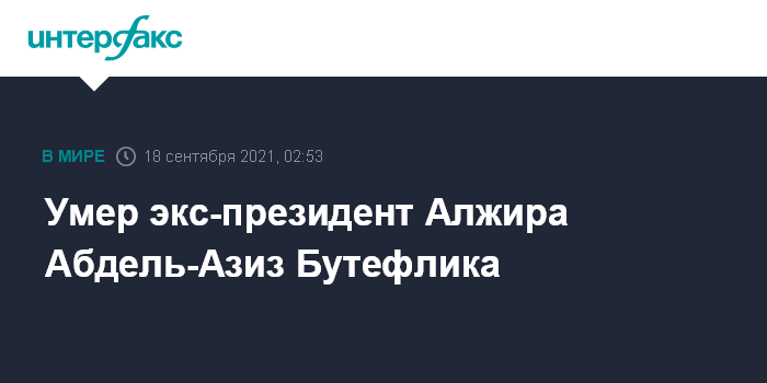 Москва. 18 сентября. INTERFAX.RU - Бывший президент Алжира Абдель-Азиз Бутефлика скончался в возрасте 84 лет. Об этом сообщает Associated Press со ссылкой на государственное телевидение страны.