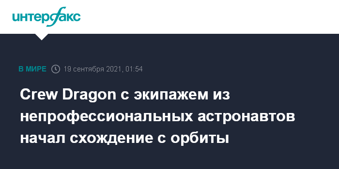 Москва. 19 сентября. INTERFAX.RU - Космический корабль Crew Dragon с первым в мире полностью непрофессиональным коммерческим экипажем после трёхдневного полета в воскресенье по московскому времени начал схождение с орбиты, сообщила американская компания SpaceX.
