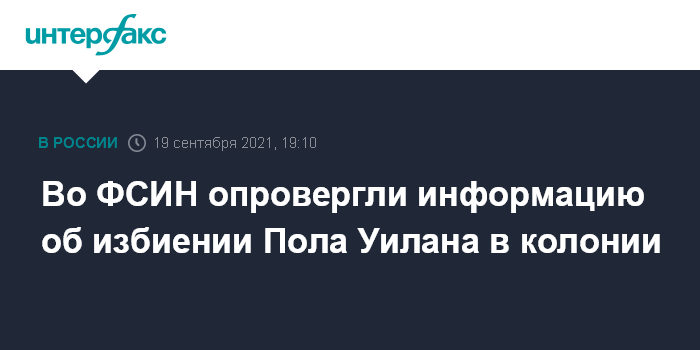 "Информация о том, что осужденного Пола Уилана якобы кто-то ударил в здании администрации исправительной колонии, не соответствует действительности и является провокацией", - говорится в сообщении пресс-бюро УФСИН, поступившем в воскресенье в "Интерфакс".