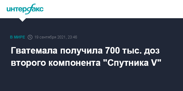 Москва. 19 сентября. INTERFAX.RU - 700 тыс. доз второго компонента российской вакцины против коронавируса "Спутник V" доставлено в Гватемалу, сообщил в воскресенье Российский фонд прямых инвестиций (РФПИ).
