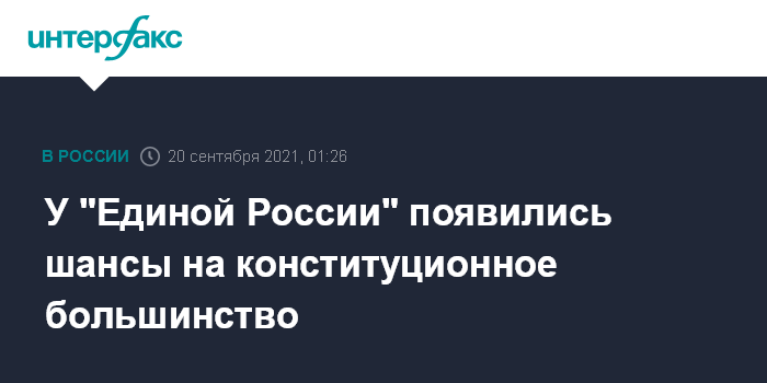 Москва. 20 сентября. INTERFAX.RU - Партия "Единая Россия" имеет шансы на получение конституционного большинства в новом составе Государственной думы, следует из предварительных итогов голосования.