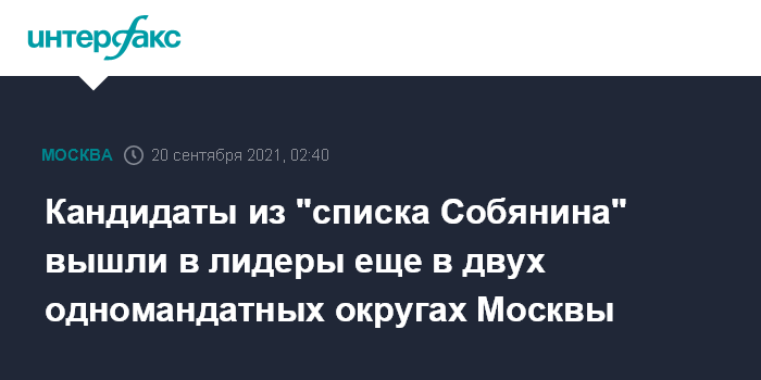 Москва. 20 сентября. INTERFAX.RU - По первым объединенными результатам электронного и очного голосования в Москве кандидаты из "списка Собянина" получили преимущество еще в двух округах, передал корреспондент "Интерфакса".