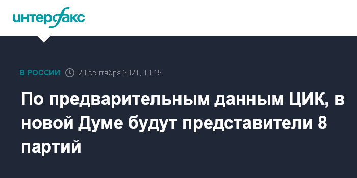 Москва. 20 сентября. INTERFAX.RU - В новом составе Госдумы, согласно предварительным подсчетам результатов голосования, могут оказаться представители восьми партий и три самовыдвиженца.