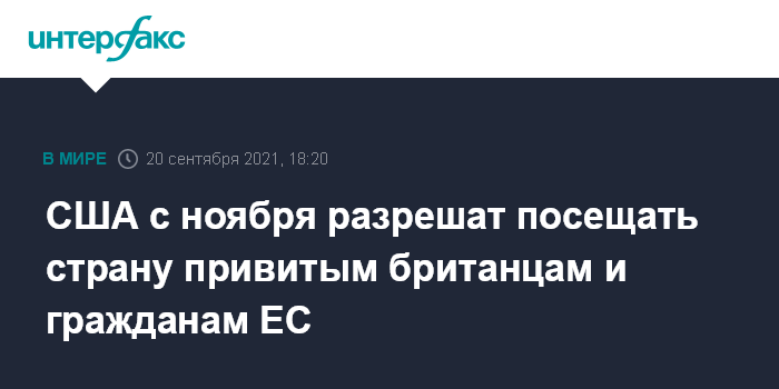 Москва. 20 сентября. INTERFAX.RU - Путешественники из Великобритании и стран Евросоюза, прошедшие вакцинацию от COVID-19, с ноября смогут посещать США, сообщает издание Financial Times со ссылкой на знакомые с ситуацией источники.
