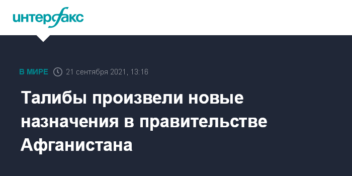 Москва. 21 сентября. INTERFAX.RU - Афганское движение "Талибан" (запрещенная в России террористическая организация) объявила о новых назначениях в составе своего временного правительства.