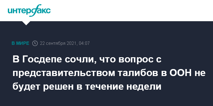 Москва. 22 сентября. INTERFAX.RU - Представитель американского Госдепа считает, что во время проходящей на сессии Генассамблеи ООН недели высокого уровня вопрос с представительством во всемирной организации движения "Талибан" (запрещено в РФ как террористическая организация) решен не будет.