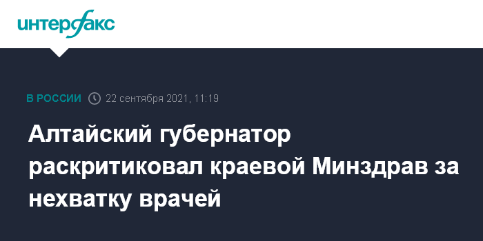 Москва. 22 сентября. INTERFAX.RU - Губернатор Алтайского края Виктор Томенко на заседании правительства обвинил краевой Минздрав в отсутствии кардинальных решений для увеличения количества медиков в системе здравоохранения региона. Он отметил, что в крае число врачей уменьшается быстрее, чем население.