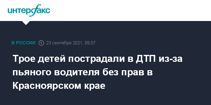Москва. 23 сентября. INTERFAX.RU - Два подростка и двухлетняя девочка-пассажир пострадали в аварии по вине пьяного водителя в Красноярском крае, сообщает пресс-служба ГУ МВД по региону