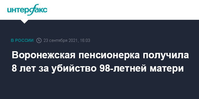 Москва. 23 сентября. INTERFAX.RU - Суд в Воронеже вынес приговор 69-летней местной жительнице, обвиняемой в убийстве своей матери, сообщает СУ СКР по региону в четверг.