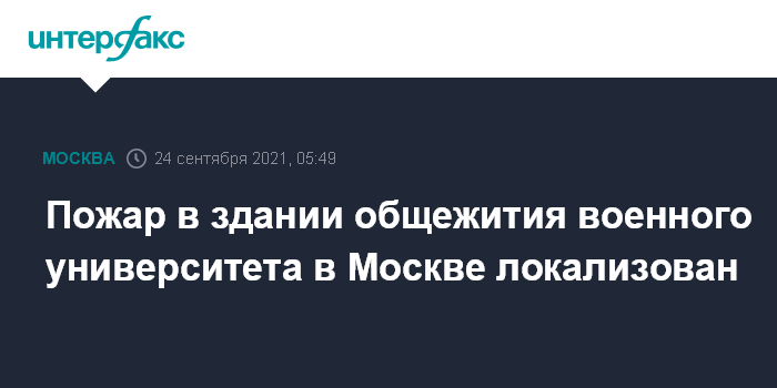 Москва. 24 сентября. INTERFAX.RU - Пожарные подразделения не допустили распространения огня, возникшего в здании общежития военного университета в центре Москвы, сообщили в пресс-службе столичного управления МЧС.