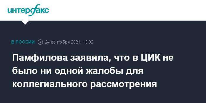 Москва. 24 сентября. INTERFAX.RU - В Центральную избирательную комиссию (ЦИК) РФ не поступало ни одной жалобы на сентябрьские выборы в России, которая бы требовала коллегиального рассмотрения, заявила глава ЦИК Элла Памфилова.