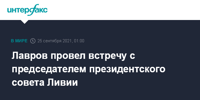 Москва. 25 сентября. INTERFAX.RU - Глава МИД РФ Сергей Лавров предложил на встрече с председателем президентского совета Ливии Мухаммедом аль-Менфи обсудить вопросы, связанные с оказанием помощи стране со стороны международного сообщества.