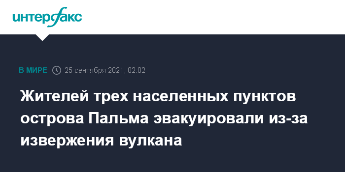 Ранее сообщалось, что извержение вулкана на Канарских островах может продлиться три месяца. Власти испанского острова Пальма, входящего в Канарский архипелаг в Атлантическом океане, были вынуждены эвакуировать 5 тыс. жителей 20 сентября. Эксперты считают, что извержение может длиться несколько недель или даже месяцев. Предыдущий раз на острове в 1971 году извергался вулкан Тенегия.
