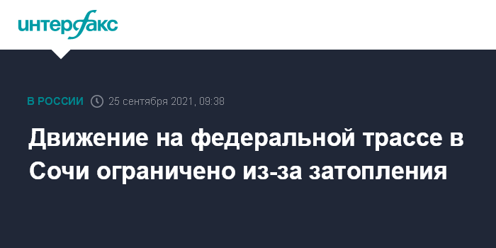 Москва. 25 сентября. INTERFAX.RU - Движение на федеральной автодороге "Джубга-Сочи-граница с Республикой Абхазия" в Сочи ограничено в связи с затоплением проезжей части, сообщает отдел пропаганды УГИБДД по Краснодарскому краю.