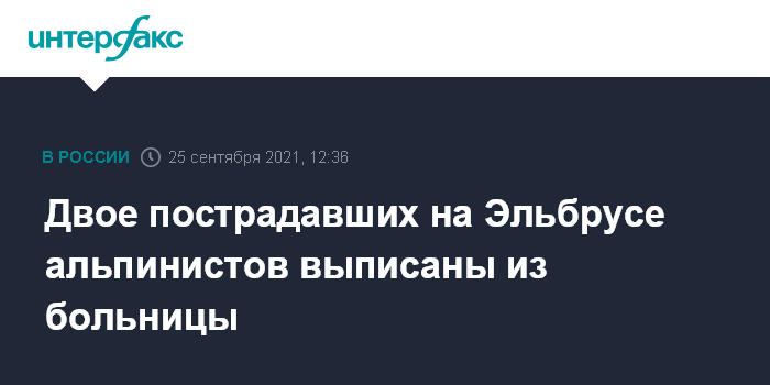Москва. 25 сентября. INTERFAX.RU - Двух пострадавших по время восхождения на Эльбрус альпинистов выписали из больницы, сообщили "Интерфаксу" в субботу в министерстве здравоохранения Кабардино-Балкарии.