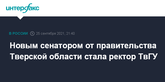 Москва. 25 сентября. INTERFAX.RU - Губернатор Тверской Игорь Руденя подписал постановление о наделении полномочиями сенатора РФ от правительства Тверской области на срок полномочий главы региона ректора Тверского государственного университета (ТвГУ) Людмилу Скаковскую, сообщили в субботу "Интерфаксу" в пресс-службе регионального правительства.