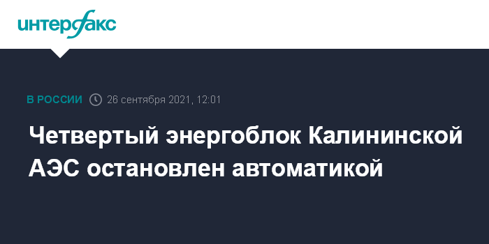 Москва. 26 сентября. INTERFAX.RU - Четвертый энергоблок Калининской АЭС остановлен автоматикой в воскресенье, сообщает Росэнергоатом.