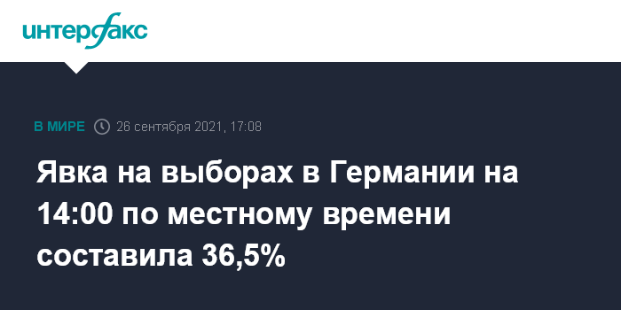 Москва. 26 сентября. INTERFAX.RU - Явка на парламентских выборах в Германии по состоянию на 14:00 (15:00 по Москве) составила 36,5%, сообщила избирательная комиссия.