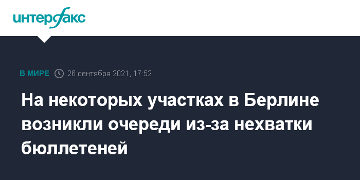 Москва. 26 сентября. INTERFAX.RU - На некоторых избирательных участках в Берлине возникли хаос и очереди из-за нехватки бюллетеней и сотрудников, это, в свою очередь, происходит потому, что одновременно с выборами в городе в воскресенье проходит Берлинский марафон и центральные улицы перекрыты.