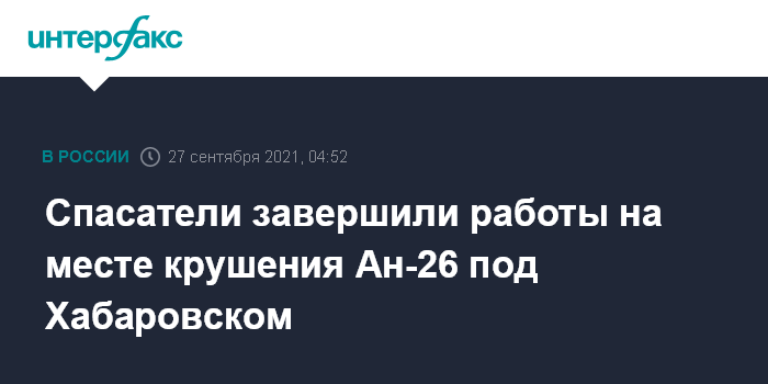 Москва. 27 сентября. INTERFAX.RU - Работы на месте крушения Ан-26 в пригороде Хабаровска завершены, сообщили "Интерфаксу" в пресс-службе ГУ МЧС по Хабаровскому краю.