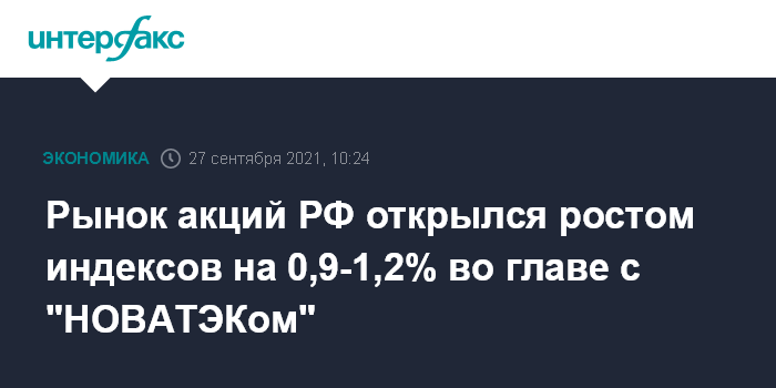 Москва. 27 сентября. INTERFAX.RU - Рынок акций РФ на старте торгов в понедельник растет вслед за раллирующей нефтью (Brent превысила $79 за баррель) на опасениях ограничения предложения, в то время как внешние фондовые площадки подают смешанные сигналы; индексы МосБиржи и РТС за минуту торгов прибавили 0,9-1,2%, причем первый поднялся в область исторического максимума во главе с бумагами "НОВАТЭКа".