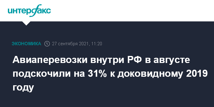 Москва. 27 сентября. INTERFAX.RU - Авиаперевозки внутри РФ в августе 2021 года выросли на 31,3% к августу "доковидного" 2019 года, до 10,639 млн человек, следует из уточненной статистики Росавиации.