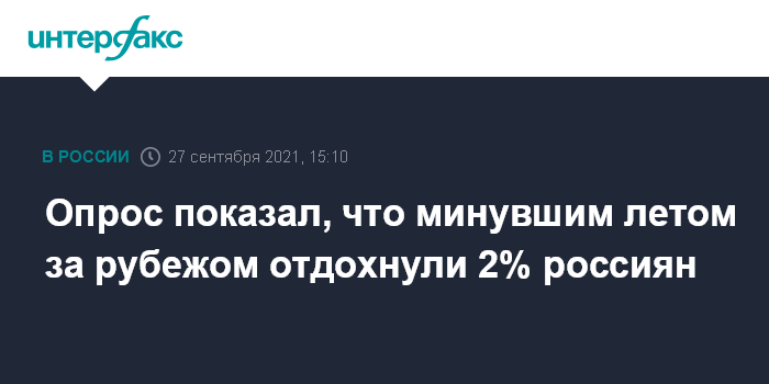 Москва. 27 сентября. INTERFAX.RU - За пределами России прошедшим летом отдыхали 2% россиян, свидетельствуют данные опроса ВЦИОМ, поступившие в понедельник в "Интерфакс".