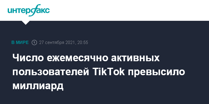 Москва. 27 сентября. INTERFAX.RU - Количество ежемесячно активных пользователей сервиса обмена короткими видео TikTok превысило 1 млрд, говорится в сообщении платформы.