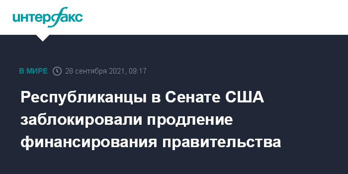 Москва. 28 сентября. INTERFAX.RU - Американские законодатели-республиканцы заблокировали одобрение в Сенате пакета мер, продлевающего финансирование правительства США до 3 декабря текущего года.
