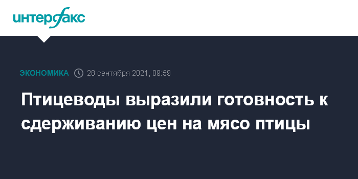 Москва. 28 сентября. INTERFAX.RU - Птицеводы РФ готовы к сдерживанию роста цен на мясо птицы, ждут согласия торговых сетей участвовать в этом процессе.