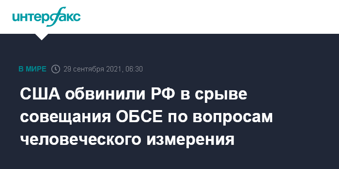 Москва. 29 сентября. INTERFAX.RU - США выразили сожаление тем, что Россия заблокировала проведение ежегодного совещания ОБСЕ по реализации человеческого измерения якобы с целью избежать критики в нарушении прав человека. Конференция должна была открыться 27 сентября в Варшаве.