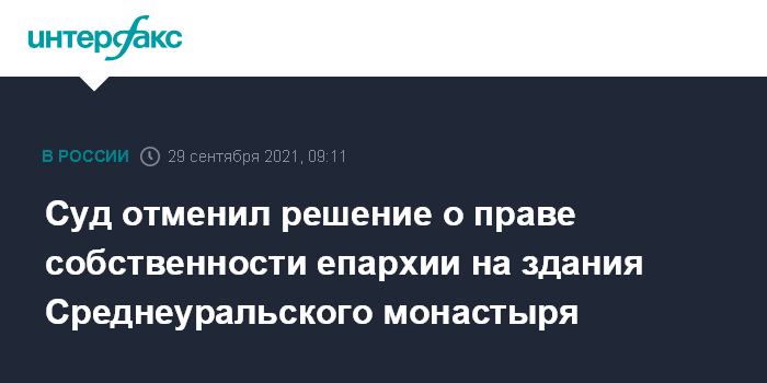 Москва. 29 сентября. INTERFAX.RU - Семнадцатый арбитражный апелляционный суд в Перми отменил решение первой инстанции о признании за Екатеринбургской епархией права собственности на 14 зданий на территории Среднеуральского женского монастыря, следует из материалов суда.
