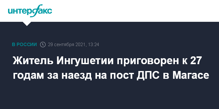 Москва. 29 сентября. INTERFAX.RU - Южный окружной военный суд приговорил жителя Ингушетии Ахмеда Имагожева к 27 годам колонии строгого режима, сообщили в СКР. Он признан виновным в участии в террористической организации и в нападении на полицейских на посту ДПС в Магасе 31 декабря 2019 года, уточнила прокурор управления Генпрокуратуры по СКФО и ЮФО Елена Усачева.