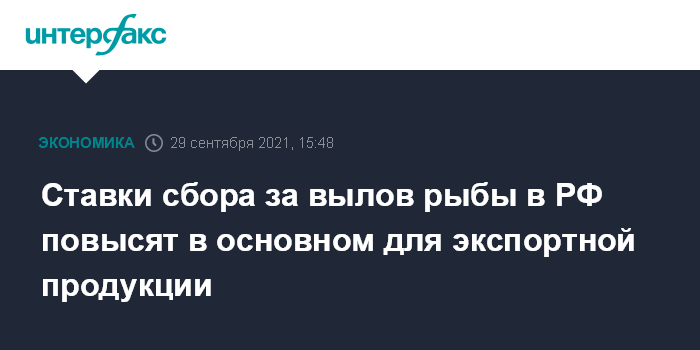 Москва. 29 сентября. INTERFAX.RU - Ставки сбора за вылов водных биоресурсов в РФ будут повышены в основном на те виды рыбы и морепродуктов, которые отправляются на экспорт. На социально значимую продукцию они меняться не будут, сообщил премьер-министр Михаил Мишустин на заседании правительства в среду.