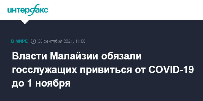 Москва. 30 сентября. INTERFAX.RU - Малайзийские власти обязали всех федеральных служащих до 1 ноября пройти полный курс вакцинации от COVID-19, сообщило в четверг издание The Guardian.