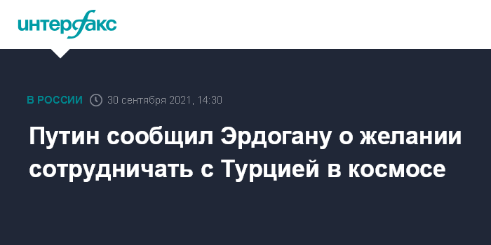 Москва. 30 сентября. INTERFAX.RU - Президент Турции Реджеп Тайип Эрдоган заявил, что российский лидер Владимир Путин на встрече выразил желание сотрудничать с Анкарой в сфере исследования космоса, сообщает издание Middle East Eye.
