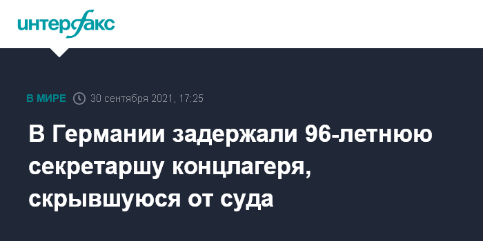Москва. 30 сентября. INTERFAX.RU - В Германии задержали 96-летнюю Ирмгард Фурхнер, служившую в годы Второй мировой войны секретаршей в концлагере Штуттгоф, ранее ей удалось скрыться от суда, сообщил телеканал Die Welt.