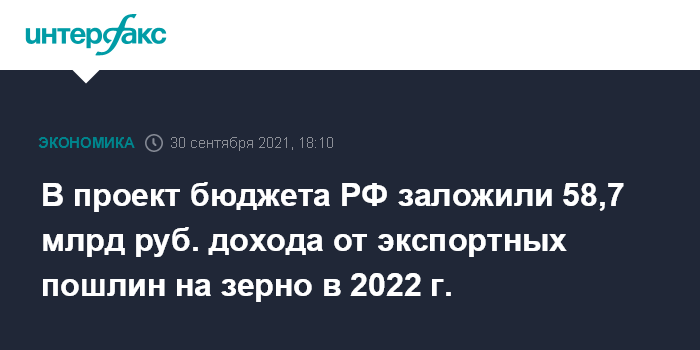 Москва. 30 сентября. INTERFAX.RU - Поступления в федеральный бюджет РФ в 2022 году от повышения в этом году экспортных пошлин на зерно составят 58 млрд 674,7 млн рублей, следует из проекта бюджета.