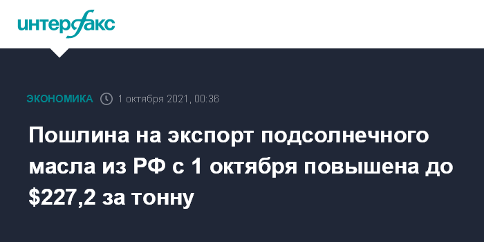 Москва. 1 октября. INTERFAX.RU - Экспортная пошлина на подсолнечное масло из РФ с 1 октября вырастет до $227,2 со $169,9 за тонну в сентябре, следует из данных Минсельхоза.