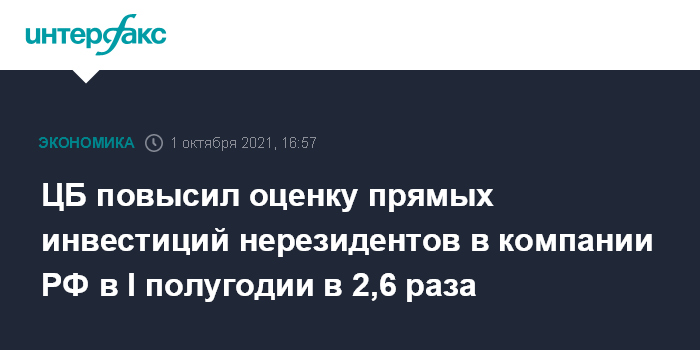ЦБ повысил оценку прямых инвестиций нерезидентов в компании РФ в I полугодии в 2,6 раза
