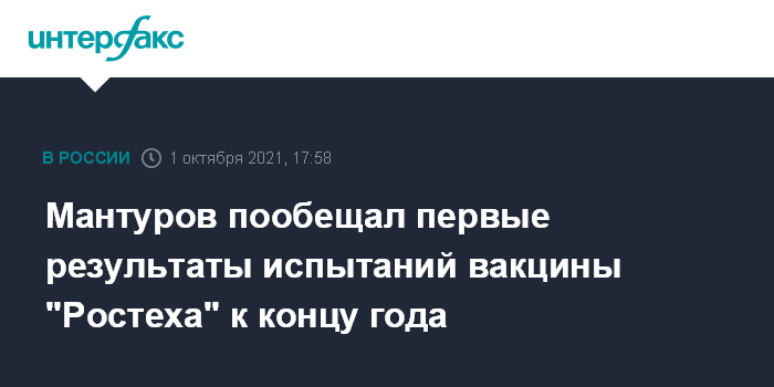 Москва. 1 октября. INTERFAX.RU - Первые результаты доклинических испытаний комбинированной вакцины против коронавируса и гриппа разработки госкорпорации "Ростех" появятся до конца 2021 года, пообещал журналистам глава Минпромторга Денис Мантуров.