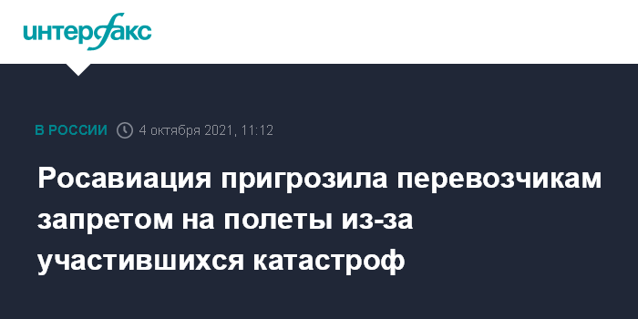 Москва. 4 октября. INTERFAX.RU - Росавиация пригрозила, что будет превентивно приостанавливать полеты авиакомпаний, если они будут недостаточно внимания уделять вопросам безопасности. Это заявление было сделано на фоне участившихся авиакатастроф, рост их числа ведомство связало с качеством менеджмента у авиаперевозчиков.