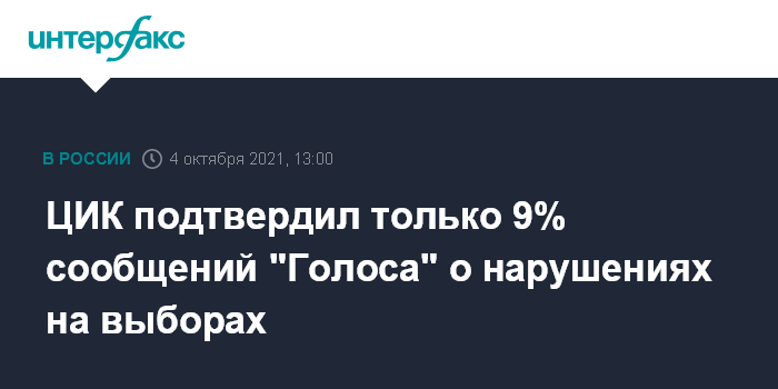Москва. 4 октября. INTERFAX.RU - Центризбирком России проверил сообщения из доклада движения "Голос" (внесено в реестр Минюста незарегистрированных общественных объединений, выполняющих функции иноагента) о нарушениях на прошедших выборах, 9% из них подтвердились, сообщила председатель комиссии Элла Памфилова.