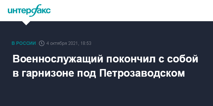 Москва. 4 октября. INTERFAX.RU - В гарнизоне Бесовец, расположенном рядом с Петрозаводском, совершил самоубийство военнослужащий. Об этом сообщили в понедельник "Интерфаксу" в пресс-службе следственного управления СКР по Карелии.