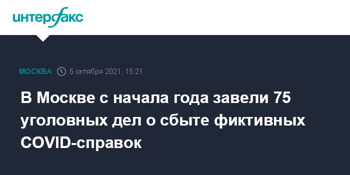 Москва. 5 октября. INTERFAX.RU - В Москве в 2021 году возбуждено 75 уголовных дел о сбыте фиктивных справок, связанных с коронавирусной инфекцией, сообщила во вторник официальный представитель МВД России Ирина Волк.