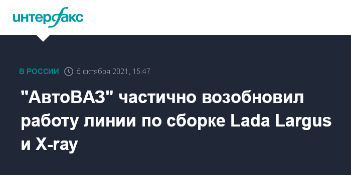 Москва. 5 октября. INTERFAX.RU - АО "АвтоВАЗ" частично возобновило работу производственной линии N1 (B0, модели Lada Largus и Lada X-ray, Renault Sandero и Logan), простой на которой из-за нехватки комплектующих изделий планировался с 4 по 5 октября включительно.