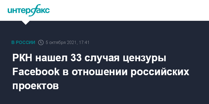 Москва. 5 октября. INTERFAX.RU - С мая 2020 года Роскомнадзор выявил 33 случая применения цензуры со стороны Facebook в отношении российских СМИ и других проектов.